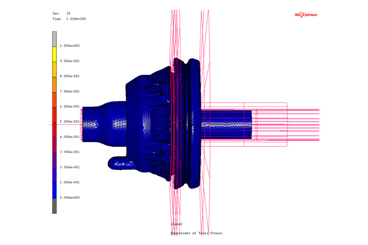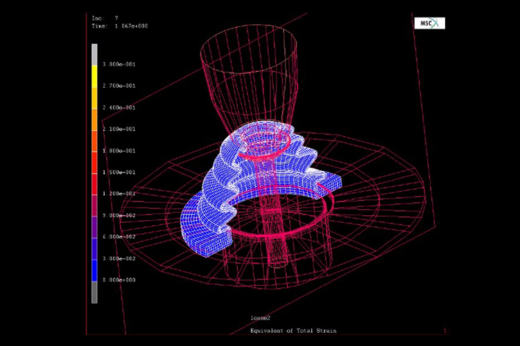 非線形構造解析システムを活用し、複雑な形状や複雑な荷重に対する問題を解くための応力や変形の理論計算をします。