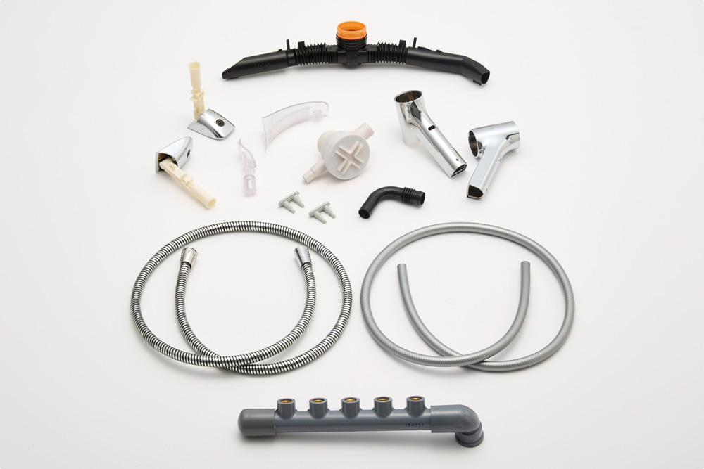 キッチン・洗面所・トイレ・浴室で使用される栓・ホースなどの身近な水回り部品から業務用厨房機器部品まで実績があります。