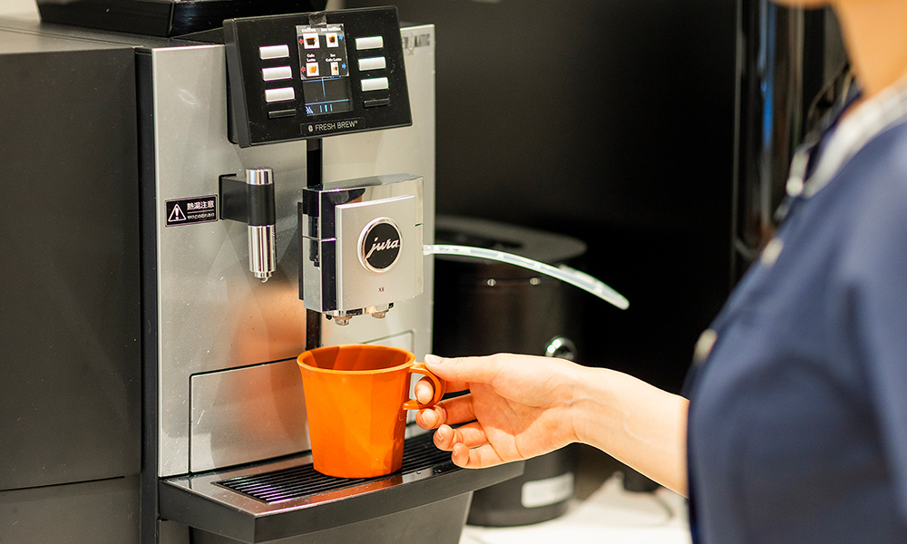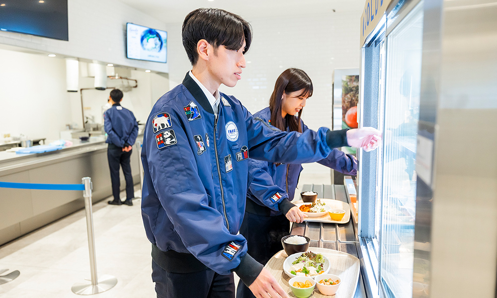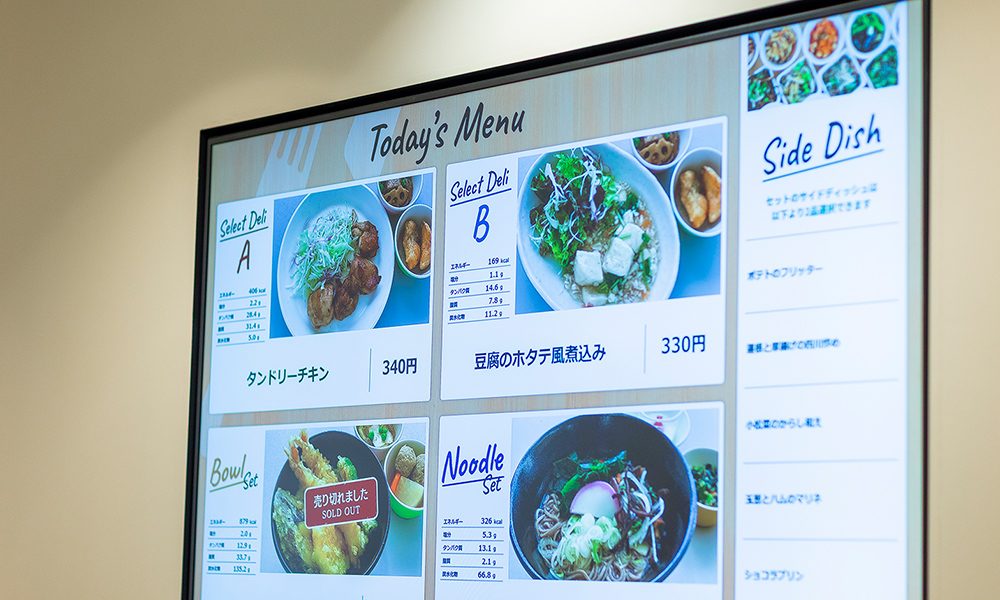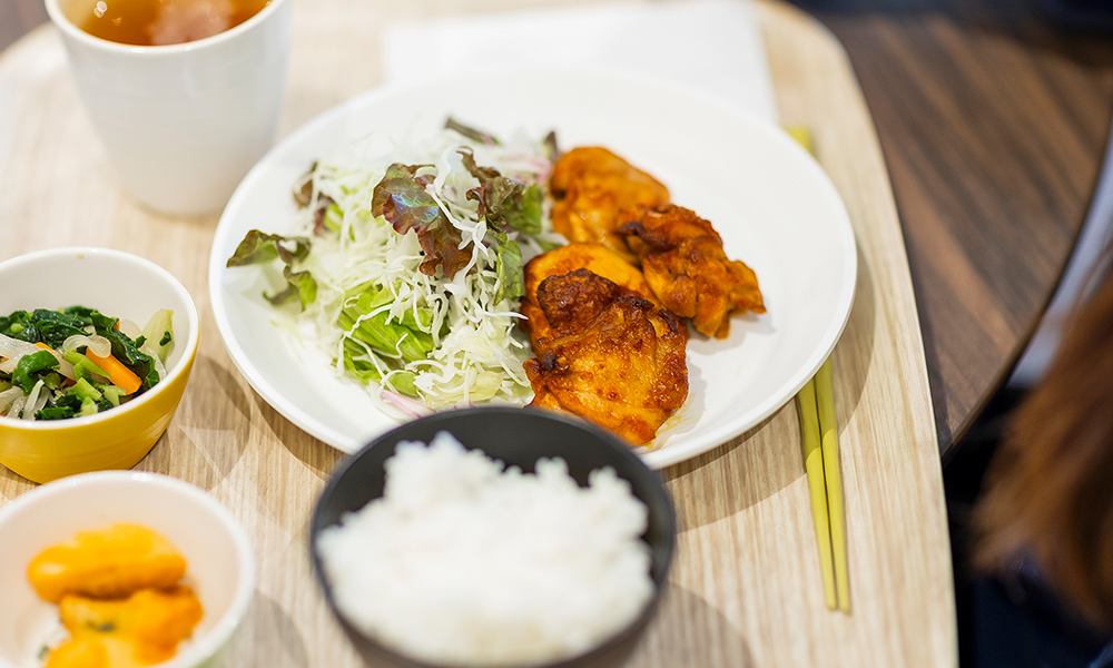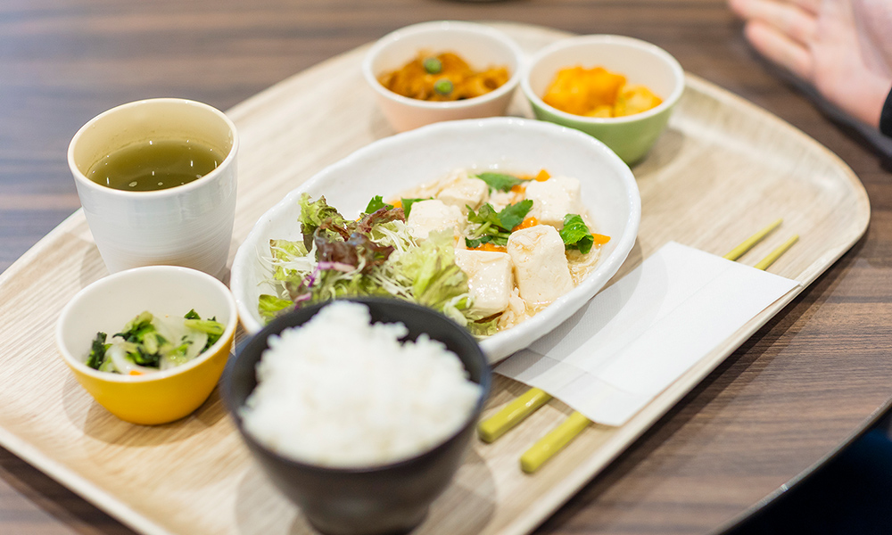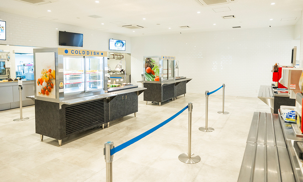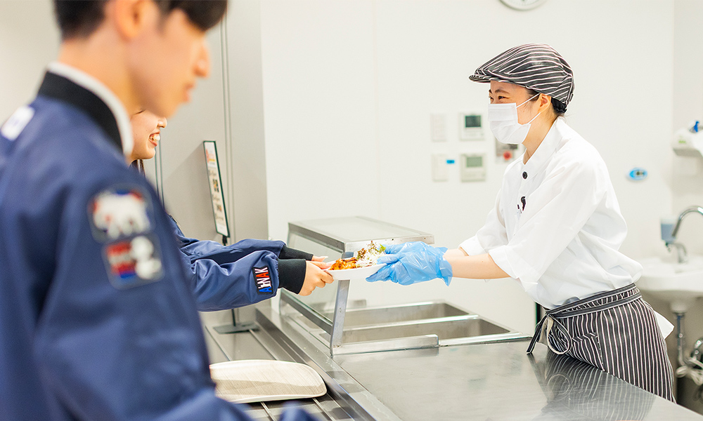 解放感ある明るい食堂で、栄養バランスの取れた日替わりメニューを用意しています。